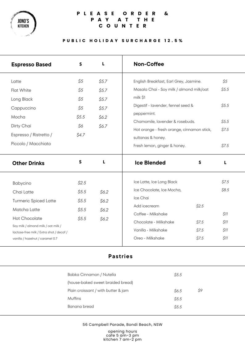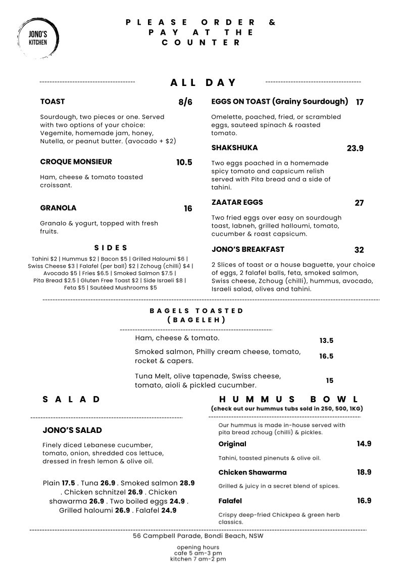 Jono’s kitchen Menu