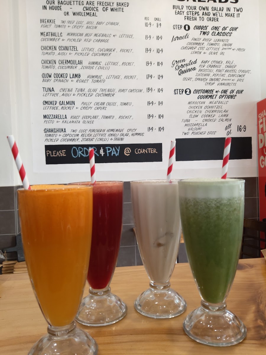 Chicken Schnitzel (Lettuce, cucumber, rocket, tomato, aioli & pickled cucumber) or Shawarma (Hummus, zchoug (chilli), lettuce, Israeli salad, pickles & tahini) + fries + soft drink.